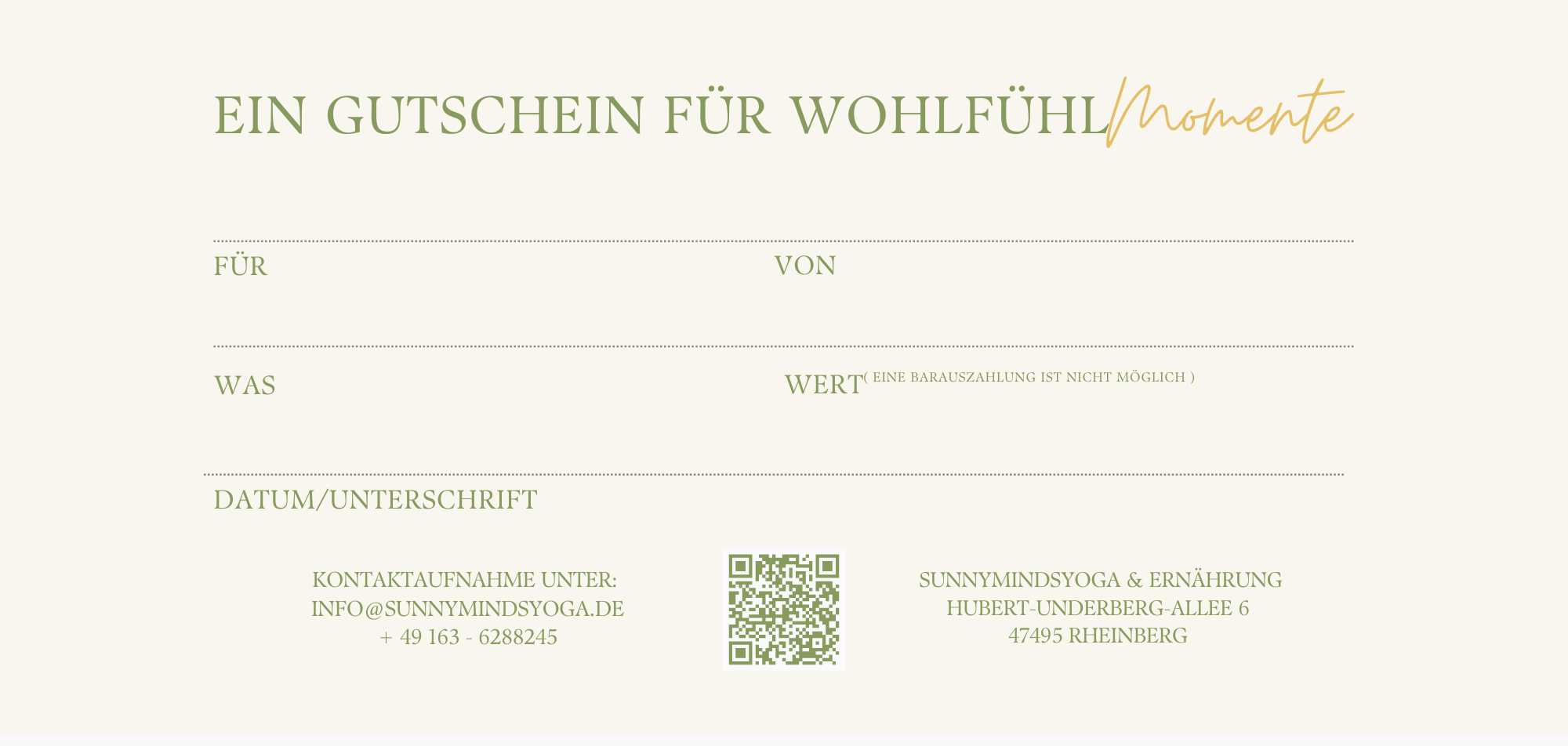 Verschenke Wohlbefinden und Entspannung mit unserem vielseitigen Geschenkgutschein! Egal ob Yoga-Enthusiast, Pilates-Liebhaber oder jemand, der eine ganzheitliche Lebensweise schätzt – mein Gutschein bietet Zugang zu einer Vielzahl von meinen Angeboten: